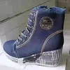 Boots Women Newpaper Lace-up Platform Wedge Ankle Denim Wedges Sneakers Platform Boots Vulcanized Shoes Ladies Side Zipper Botas