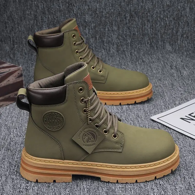 High Top Men Boots Fashion Motorcycle Ankle Boots for Men New Hot Green Male Hiking Boot Winter Lace-Up Men’s Shoes