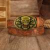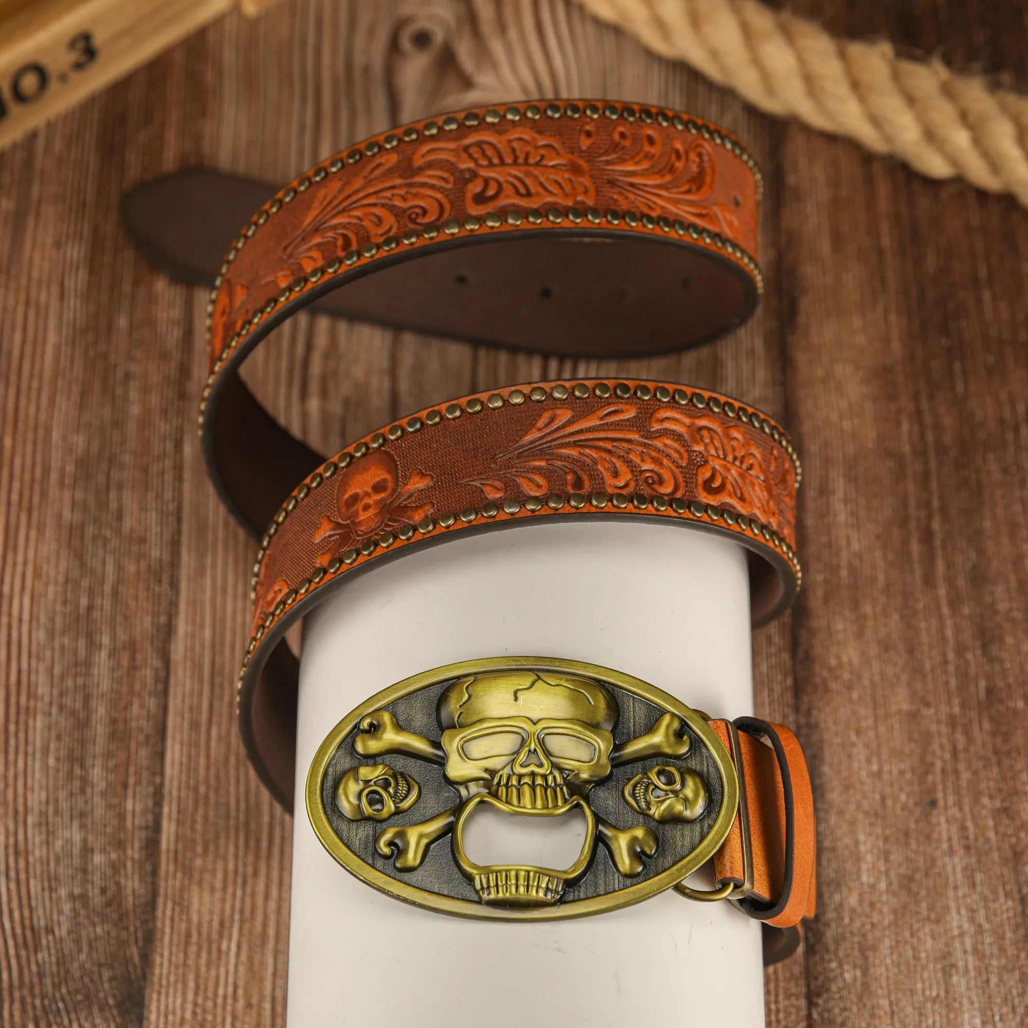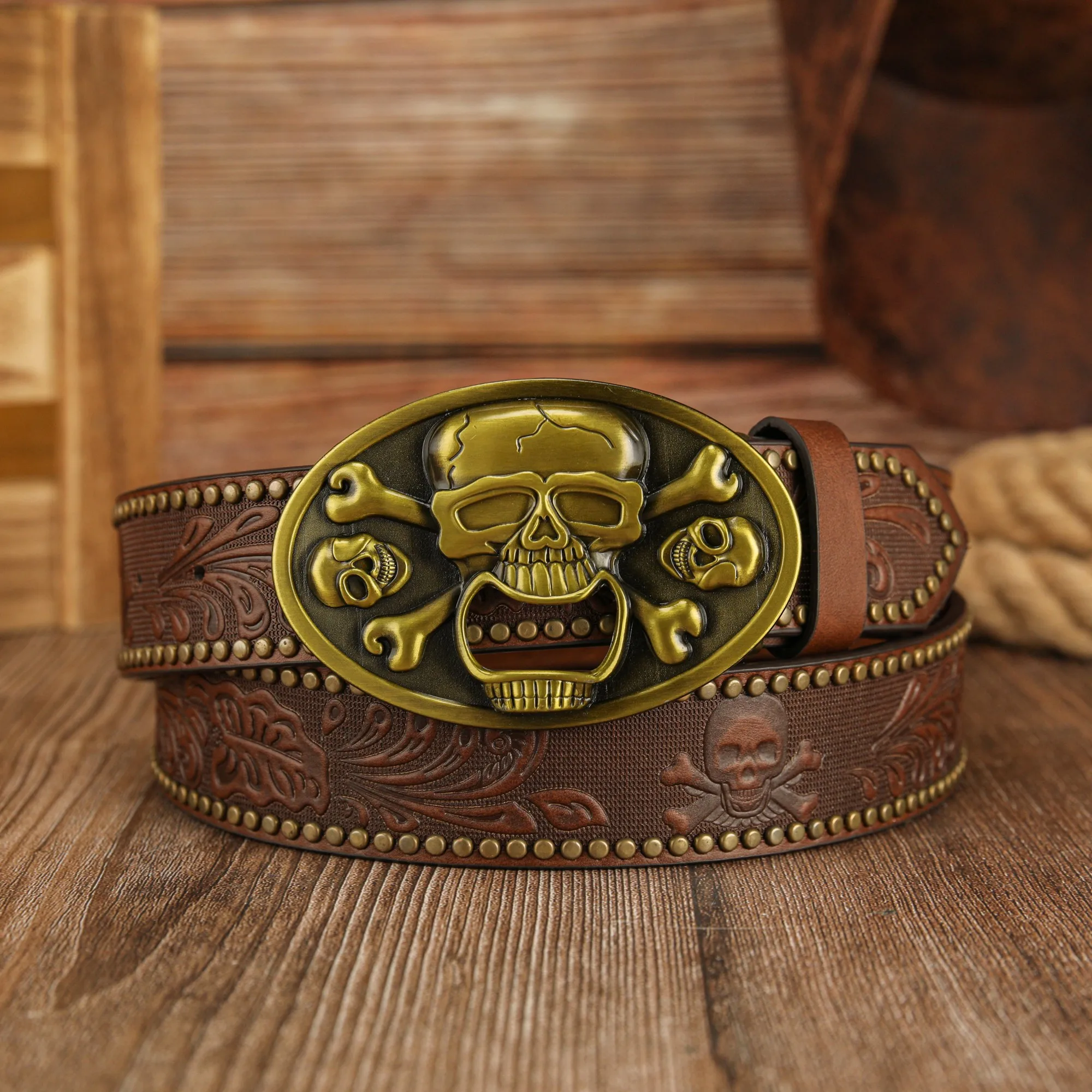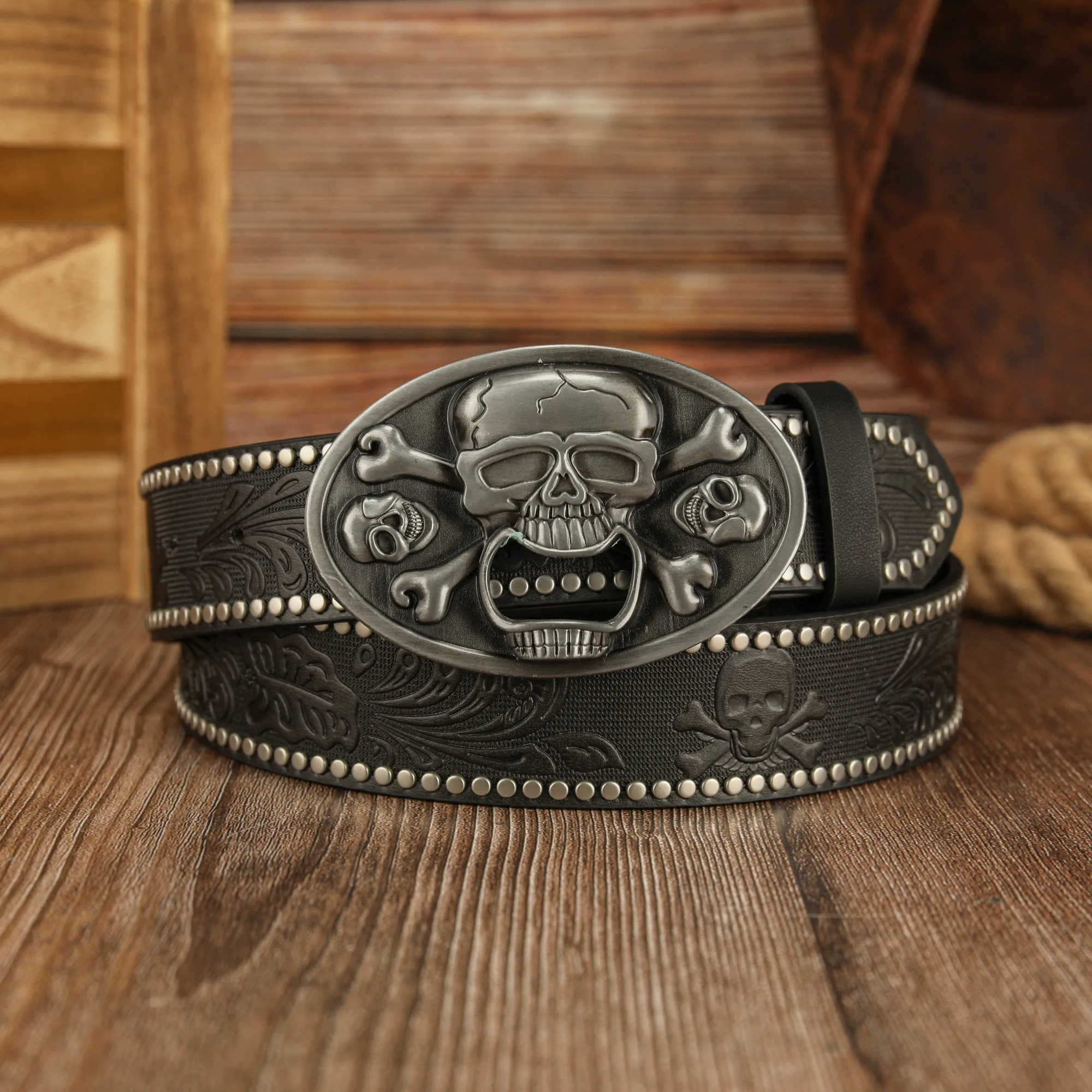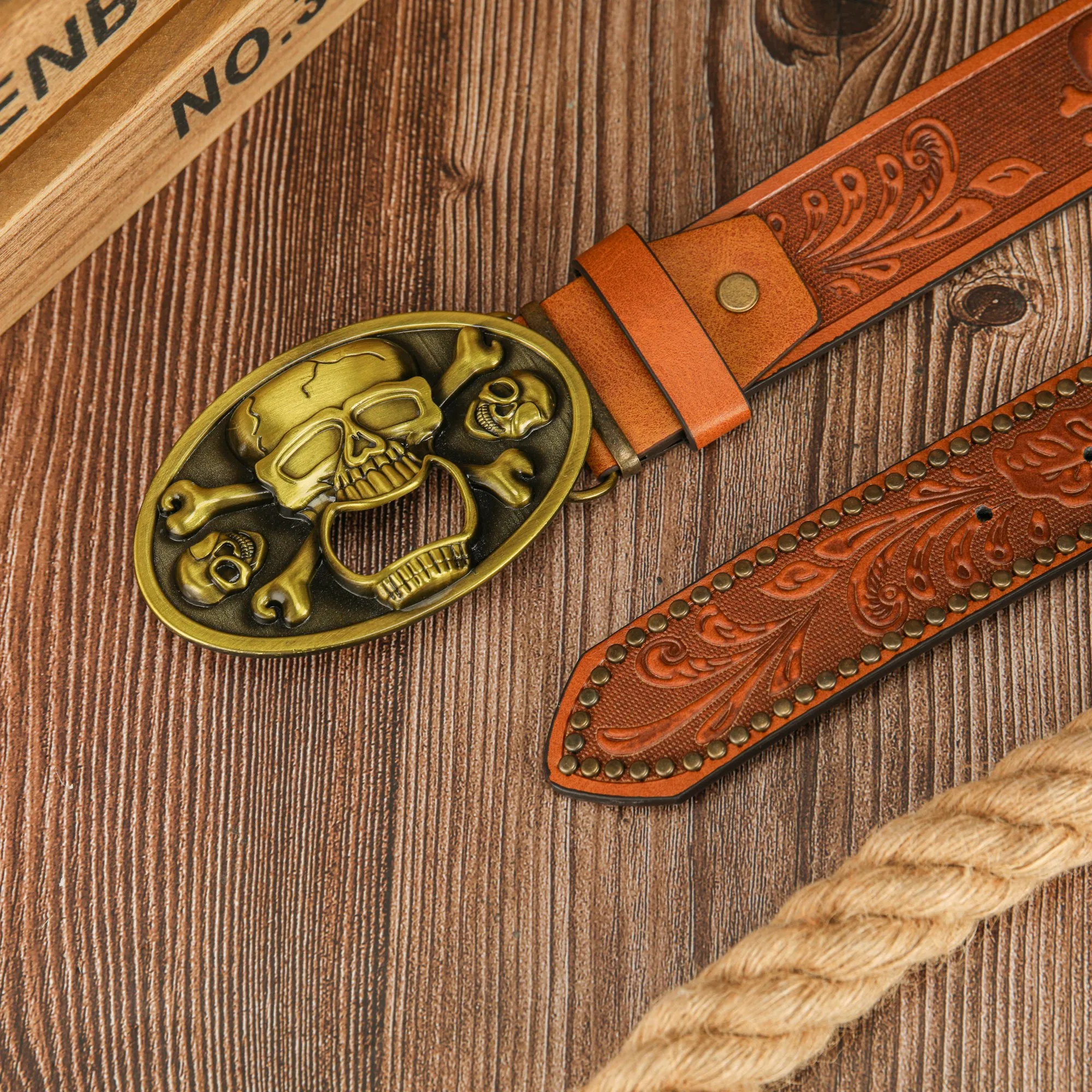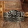 Hollow oval bone skull zinc alloy buckle retro rock skull head PU embossed rivet belt unisex belt
