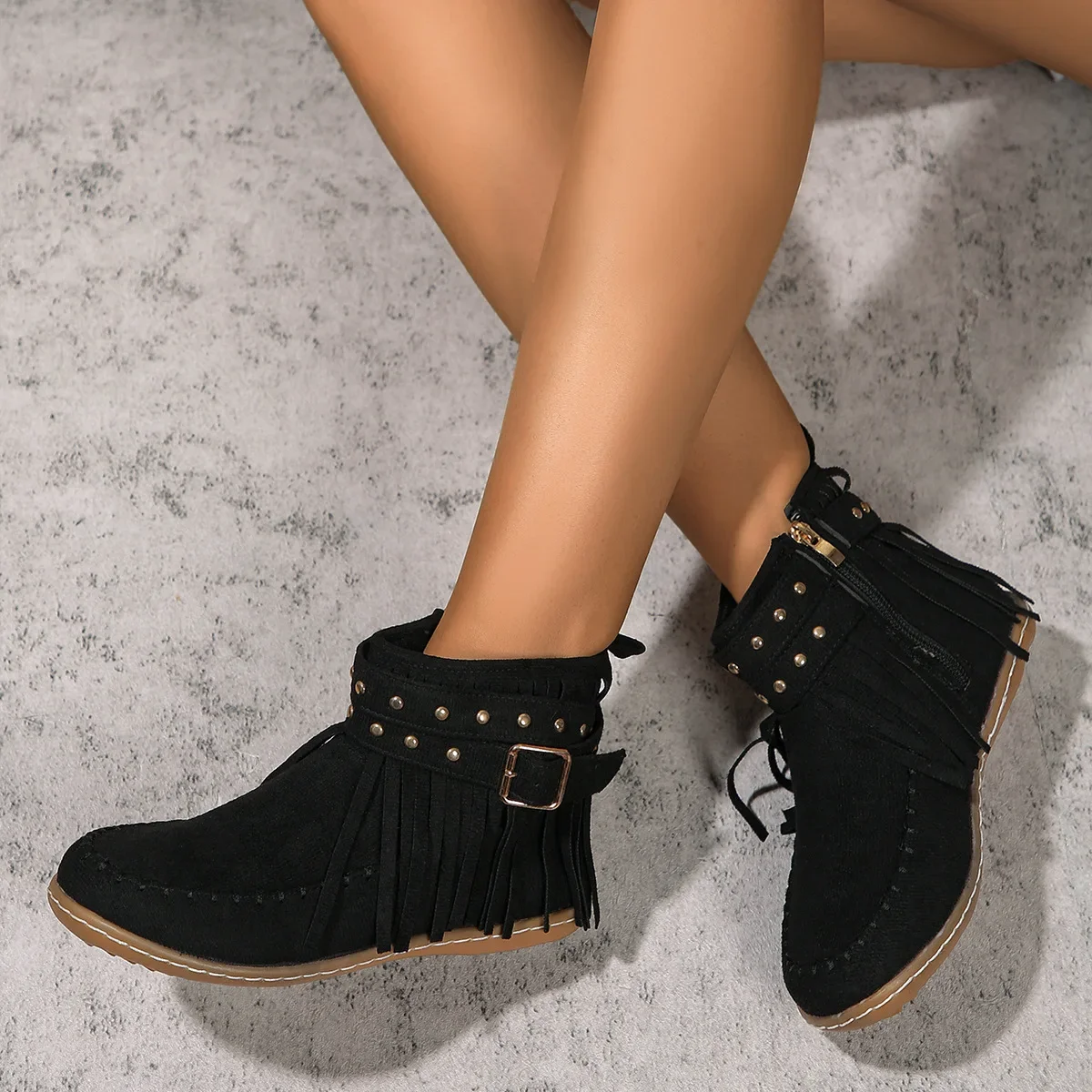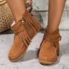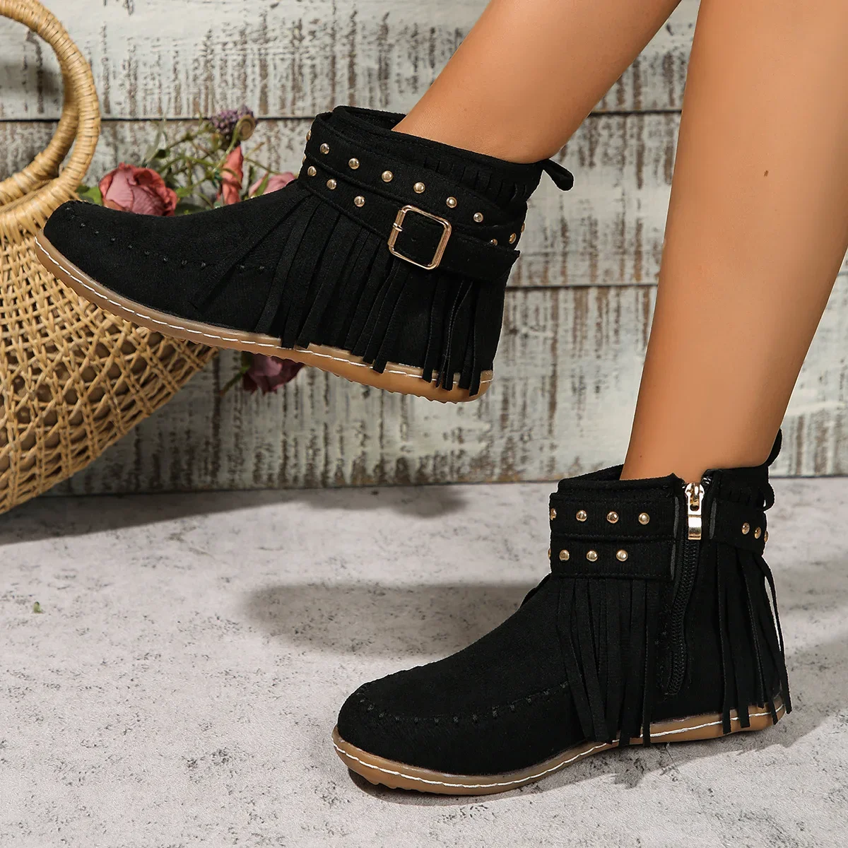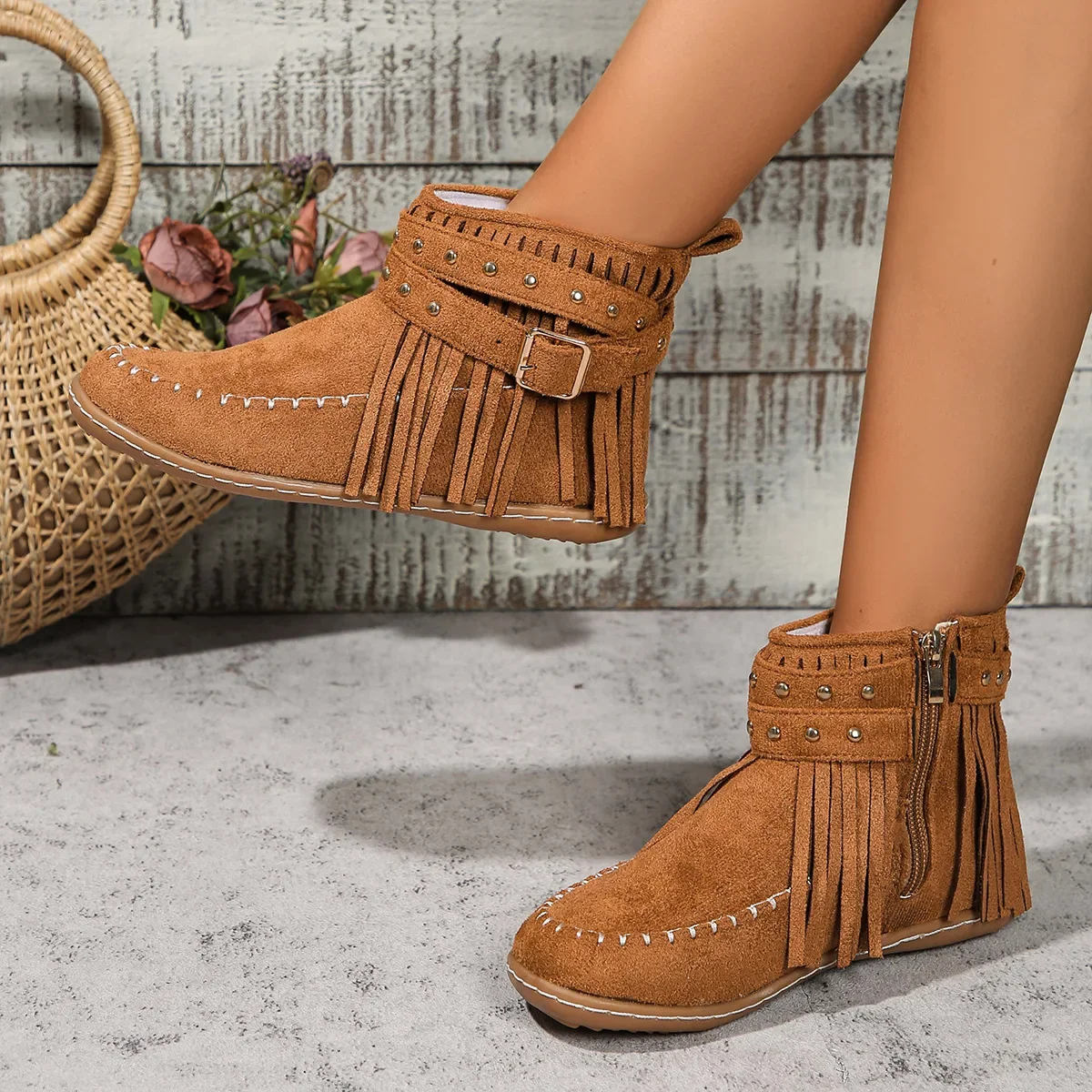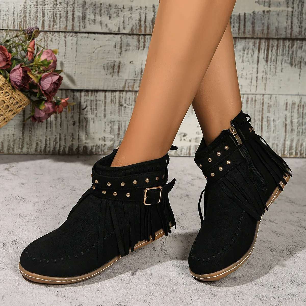 Large Size Rivet Tassel Metal Buckle Short Tube Smoke Boot Women Autumn Winter New Flat Bottom Warm Women Boots round Toe Rubber