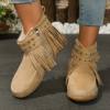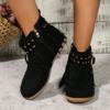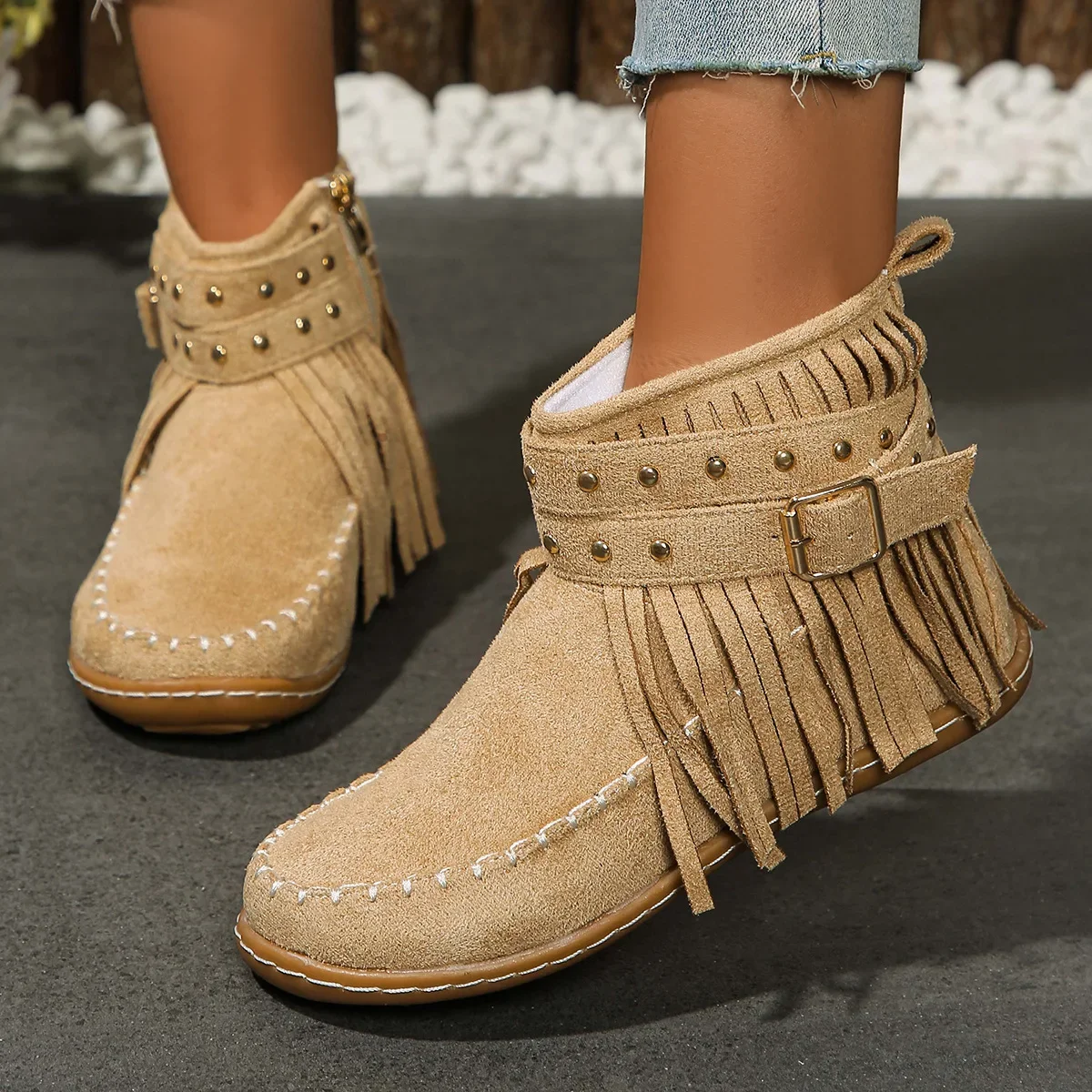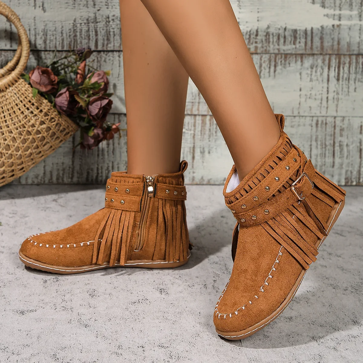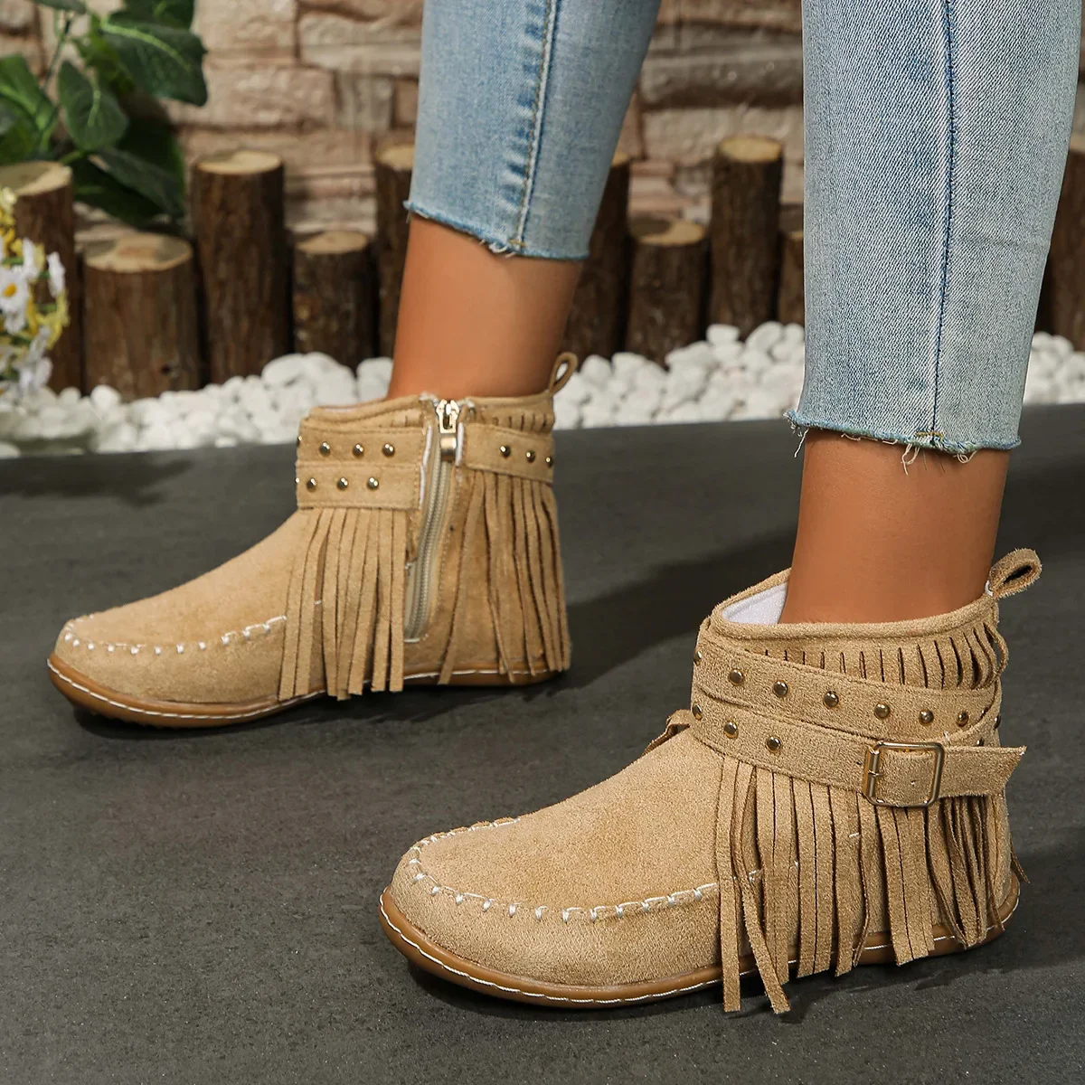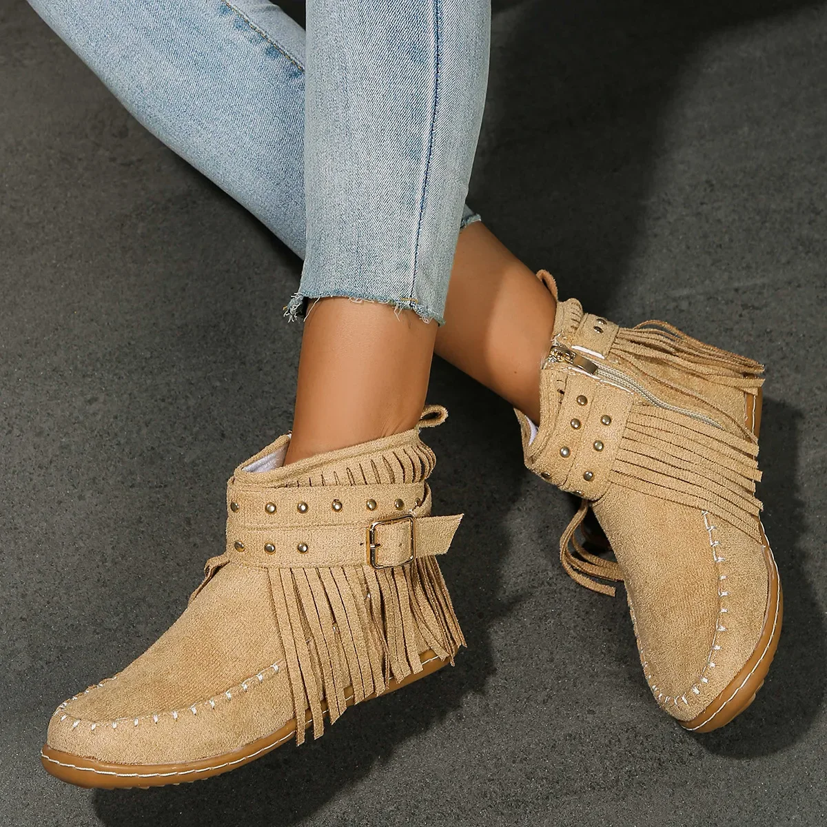 Large Size Rivet Tassel Metal Buckle Short Tube Smoke Boot Women Autumn Winter New Flat Bottom Warm Women Boots round Toe Rubber