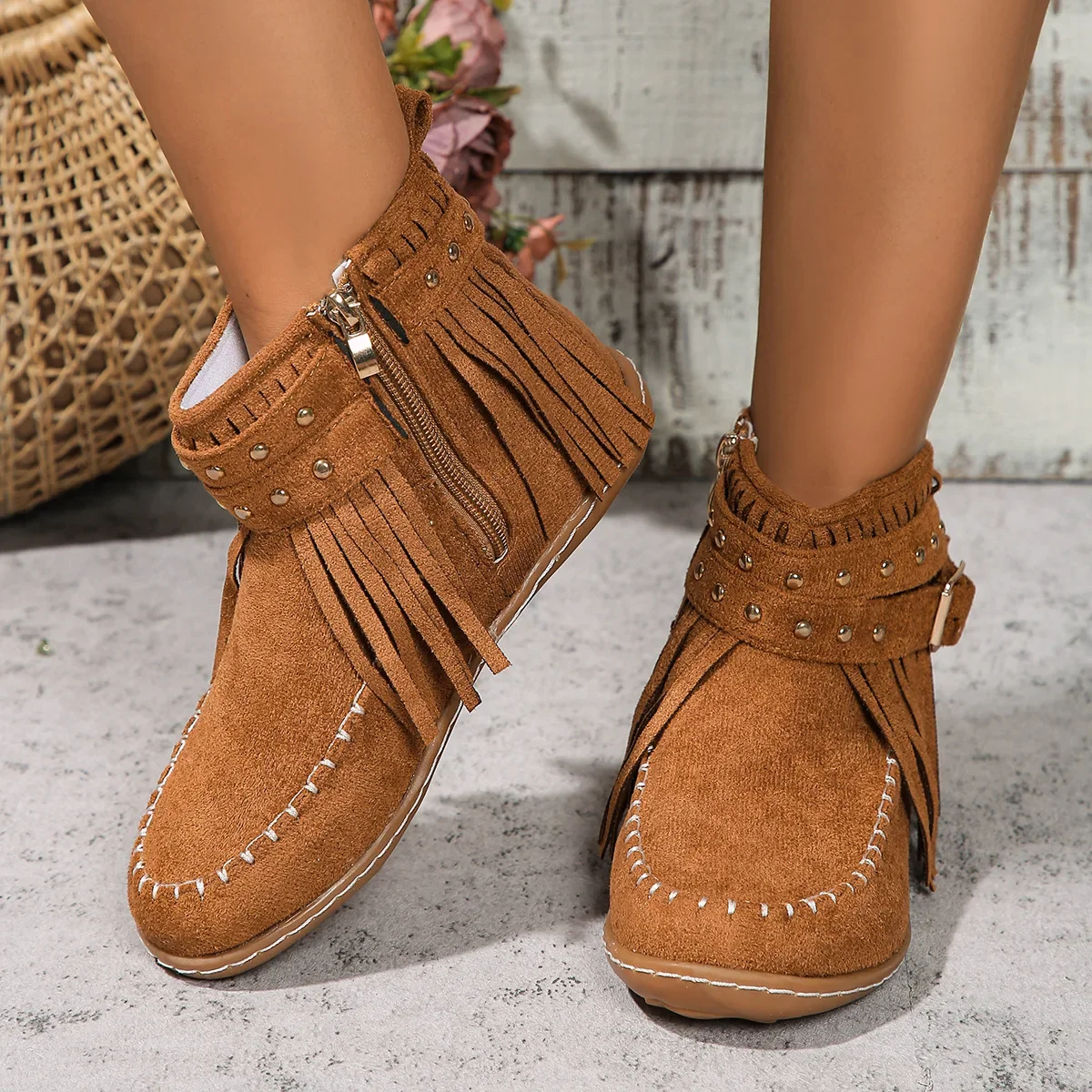 • Fashionable Design : Featuring a trendy metal buckle and tassel detail, these boots add a touch of elegance to any outfit.