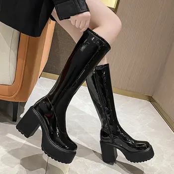 Chunky Heel Platform Long Boots for Women Black Patent Leather Knee High Boots Woman Winter 2024 Thick High Heels Punk Shoes