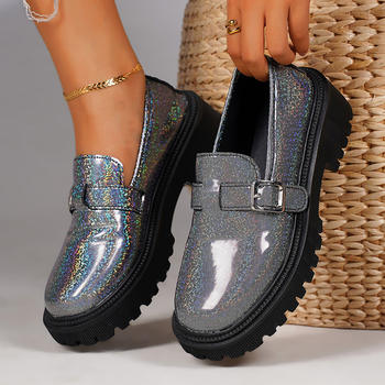 2024 Fashion Laser Loafers for Women Platform Metal Buckle Flat Shoes Woman Round Toe Slip On Casual Shoes Zapatas Mujer