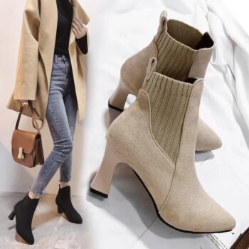 Ankle Boots Women Autumn Pointed Toe Knitted Warm Elastic Women’s Shoes Casual High Heels Platform Boots