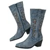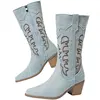 Women Embroidered Denim Western Boots Height Increasing Square Heel Mid-calf Boots for Office Nightclub Evening Party Banquet