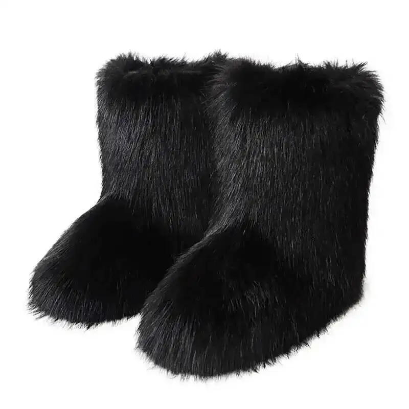 Women Faux Fur Boots Winter Fluffy Plush Warm Mid Calf Snow Boots Luxury Fashion Furry Boots Comfortable Outdoor Flat Shoes