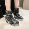 Women’s Colorblock Denim Boots, Slip On Platform Buckle & Studded Decor Belt Boots, Trendy Ankle Wedge Shoes