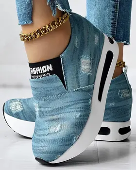 Sneakers Women’s Denim Ripped Platform Slip-On Muffin Sneakers Platform Wedges Floral Embroidery Mesh Sneakers for Women Slip On