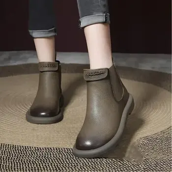 Retro Genuine Cow Leather Chelsea Boots for Women Shoes Elastic Band Ankle Boot Casual Chic Platform Non-slip Winter Short Boot